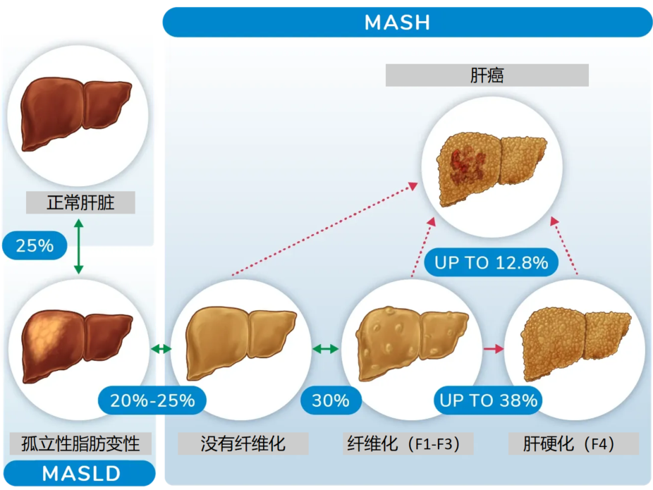 隨著時(shí)間的推移,約有40%的MASH患者纖維化程度會(huì)不斷加重,其速度約為每十年進(jìn)展1個(gè)階段。MASH患者罹患肝細(xì)胞癌的幾率明顯高于普通人群,其年發(fā)病率是MASLD的12倍(5.77 vs. 0.44人/1000人)。長期研究表明,與普通人群相比,MASH患者的總體死亡率和肝臟相關(guān)死亡率更高。由此,MASH已成為我國日益嚴(yán)峻的公共衛(wèi)生問題。