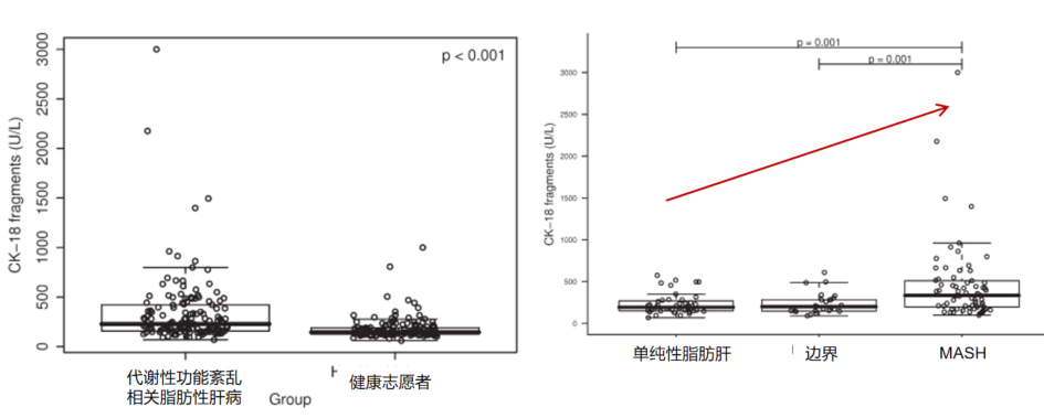 與健康人相比,MASLD患者血清CK18含量顯著升高;與單純性脂肪變性和邊緣診斷患者相比,MASH患者血清CK18含量顯著升高。MASH患者血液中CK-18片段顯著增加,CK18是MASH的獨(dú)立預(yù)測因子[1]。