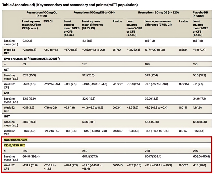 在接受Resmetirom不同劑量的治療組中,CK18的下降幅度顯著高于傳統(tǒng)肝功能標(biāo)志物[2]