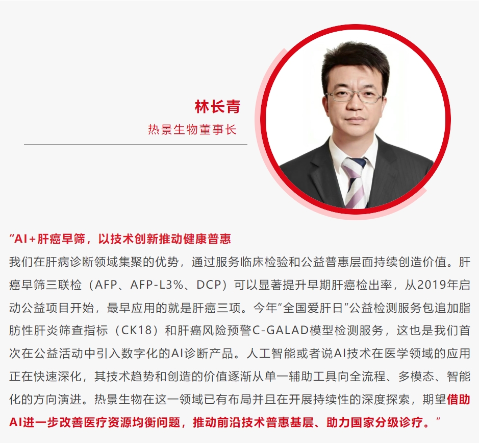 3月18日,值第25個“全國愛肝日”期間,“2025肝癌防治健康中國行——全國愛肝日”大型公益義診活動在全國30省份近百家醫(yī)院的協(xié)同下聯(lián)合展開,惠及近萬人次,公益健康服務(wù)包(肝癌三項、GP73、CK18-M30/M65等)由(九游J9)真人游戲第一品牌生物支持。2025年升級版“肝病全周期健康檢測服務(wù)包”首次融合數(shù)智化AI診斷模型,探索“AI+創(chuàng)新診療”公益新模式,通過智能算法提升肝癌篩查效益,助力實現(xiàn)"篩查-診斷-干預(yù)"全流程精準(zhǔn)管理,全面推動肝癌防治邁入數(shù)智化新階段。