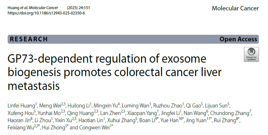 近日,北京堯景基因技術(shù)有限公司鐘輝研究員聯(lián)合廣西醫(yī)科大學附屬腫瘤醫(yī)院吳飛翔主任醫(yī)師、軍事醫(yī)學研究院魏從文研究員、遼寧省腫瘤醫(yī)院張睿主任醫(yī)師、首都兒科研究所袁靜教授等團隊在Molecular Cancer(影響因子27.7)雜志上發(fā)表題為“GP73-dependent regulation of exosome biogenesis promotes colorectal cancer liver metastasis”的重磅文章。